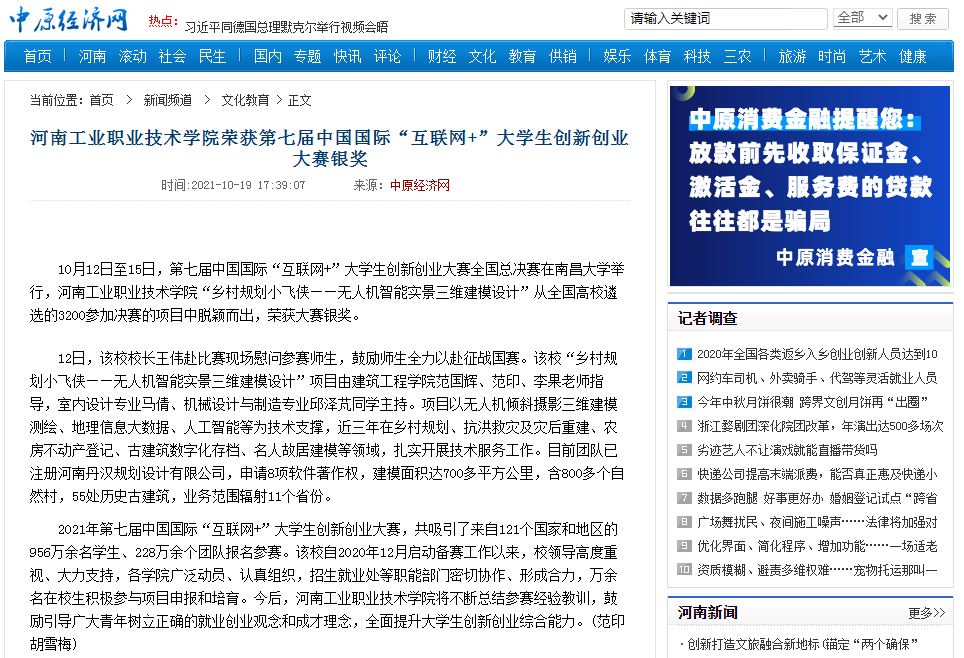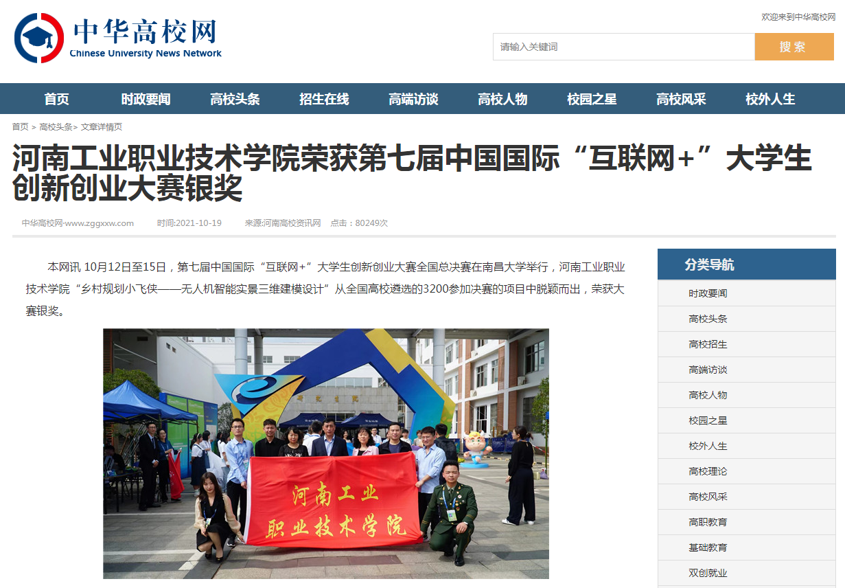 近日,第七届中国国际“互联网+”大学生创新创业大赛全国总决赛在南昌大学举行。beat365范国辉、范印、李果老师指导,由室内设计专业马倩、机械设计与制造专业邱泽芃同学主持的项目“乡村规划小飞侠--无人机智能实景三维建模设计”入围总决赛现场赛。中华网、中原经济网、中华高校网、河南高校资讯网、中新网、新豫网等媒体报道beat365荣获第七届中国国际“互联网+”大学生创新创业大赛银奖。