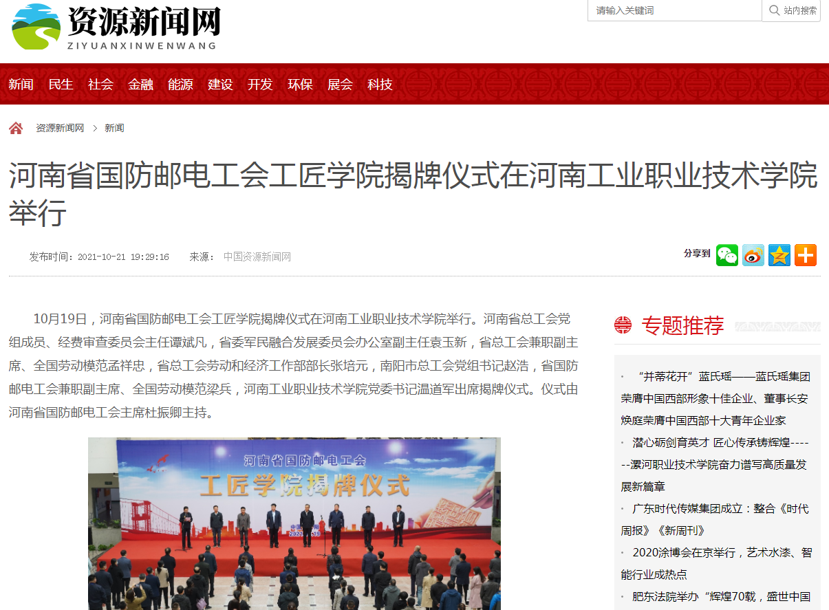 10月19日,河南省国防邮电工会工匠学院揭牌仪式在beat365举行。工匠学院的揭牌成立,既是对学校产教融合、校企合作工作的肯定,也是为国防邮电系统职工技能提升注入新动力,将高效服务于省委“创新驱动、科教兴省、人才强省”战略。河南日报、中国产业新闻网、中国资源新闻网等媒体报道了河南省国防邮电工会工匠学院揭牌仪式。