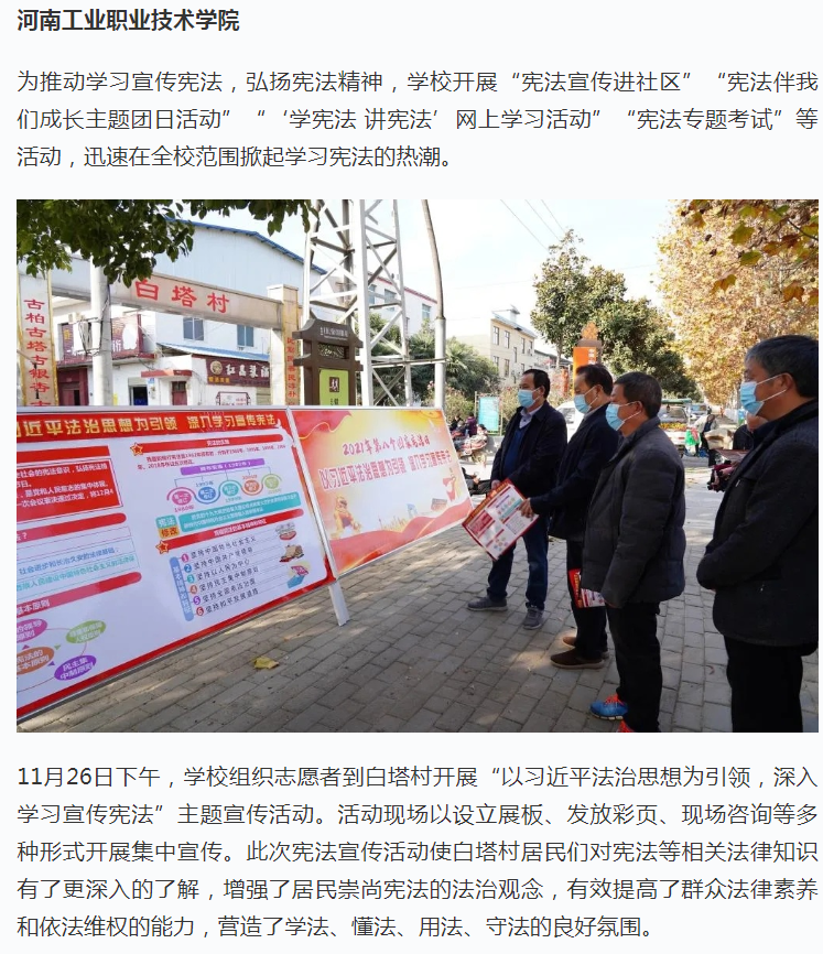 2021年12月4日是第8个国家宪法日,也迎来了第四个“宪法宣传周”。beat365统筹制定《2021年国家宪法日“宪法宣传周”系列活动方案》,扎实开展“宪法晨读”、宪法宣传进社区、“宪法伴我们成长”主题团日、宪法专题知识考试、“学宪法 讲宪法”网上学习等主题教育活动,旨在大力加强宪法学习宣传,弘扬宪法精神,维护宪法权威,推动宪法全面实施,引导广大师生不断增强走中国特色社会主义法治道路的自信和自觉,学习强国、河南高教报道beat365“宪法宣传周”系列活动。