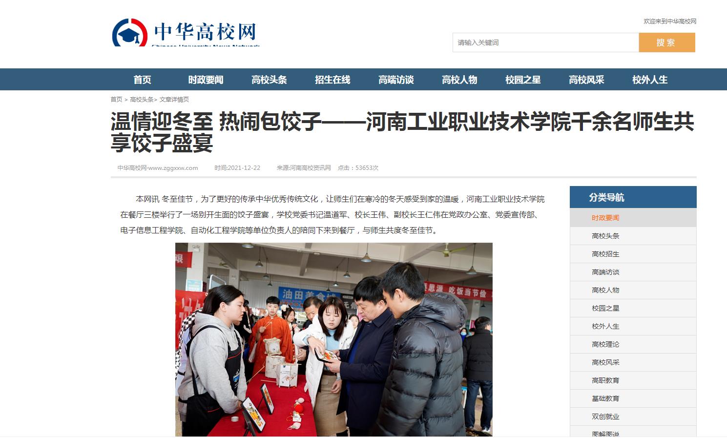 12月21日,为了更好的传承中华优秀传统文化,让师生们在寒冷的冬天感受到家的温暖,学校在餐厅三楼举行了一场别开生面的饺子盛宴,学校党委书记温道军、校长王伟、副校长王仁伟在党政办公室、党委宣传部、电子信息工程学院、自动化工程学院等单位负责人的陪同下来到餐厅,与师生共度冬至佳节。近年来学校高度重视校园文化建设,充分发挥优秀传统文化的引领作用,以“我们的节日”为载体,深入开展形式多样特色鲜明的群众性节日文化活动,引导广大师生认知、尊重、弘扬和传承中华优秀传统文化和传统美德,着力营造文明、和谐、团结的校园文化氛围,推进学校省级文明校园标兵建设再上新台阶。中华网、中华高校网、河南高校资讯网、河南高校行、中原经济网等媒体报道了学校此次活动开展的相关情况。(撰稿/杨纪争 编审/杨爽)