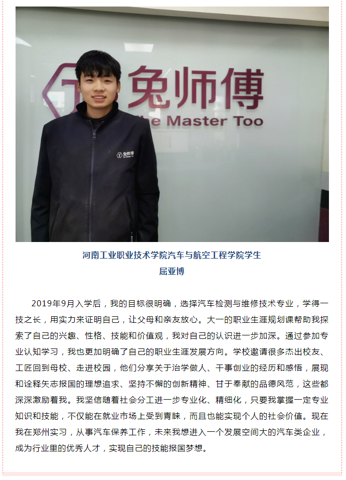 2019年9月入学后,我的目标很明确,选择汽车检测与维修技术专业,学得一技之长,用实力来证明自己,让父母和亲友放心。大一的职业生涯规划课帮助我探索了自己的兴趣、性格、技能和价值观,我对自己的认识进一步加深。通过参加专业认知学习,我也更加明确了自己的职业生涯发展方向。学校邀请很多杰出校友、工匠回到母校、走进校园,他们分享关于治学做人、干事创业的经历和感悟,展现和诠释矢志报国的理想追求、坚持不懈的创新精神、甘于奉献的品德风范,这些都深深激励着我。我坚信随着社会分工进一步专业化、精细化,只要我掌握一定专业知识和技能,不仅能在就业市场上受到青睐,而且也能实现个人的社会价值。现在我在郑州实习,从事汽车保养工作,未来我想进入一个发展空间大的汽车类企业,成为行业里的优秀人才,实现自己的技能报国梦想。(汇编/党委宣传部 编审/赵海娟)