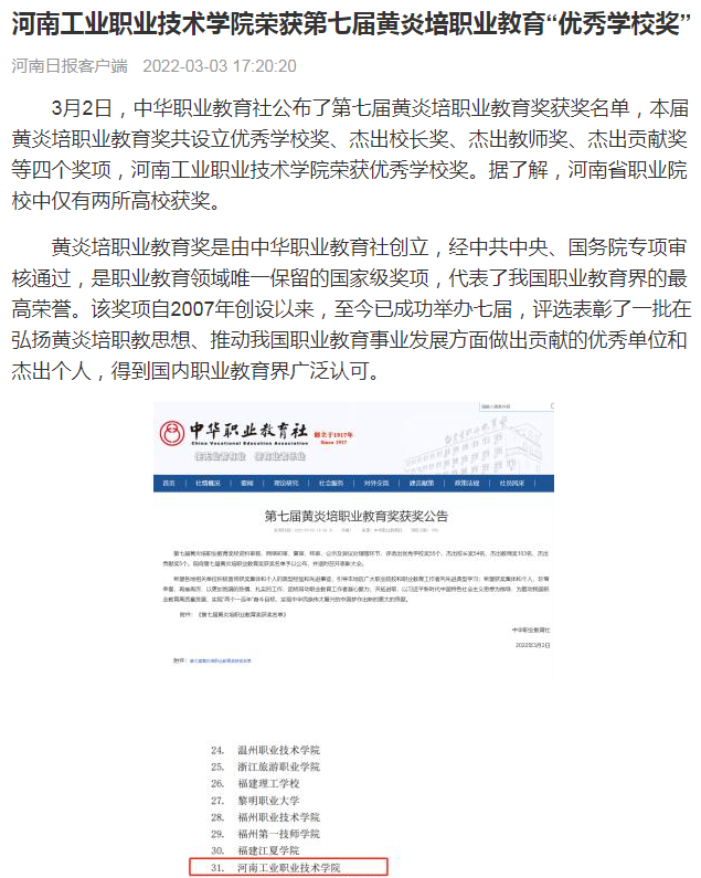 近日,中华职业教育社公布了第七届黄炎培职业教育奖获奖名单,本届黄炎培职业教育奖共设立优秀学校奖、杰出校长奖、杰出教师奖、杰出贡献奖等四个奖项,beat365荣获优秀学校奖。河南省职业院校中仅有两所高校获奖。人民日报、中国产业新闻网、河南日报等媒体报道学校荣获第七届黄炎培职业教育“优秀学校奖”。(素材来源/党委宣传部 汇编/刘天恒 单位审核/杨俊峰 编审/杨爽)