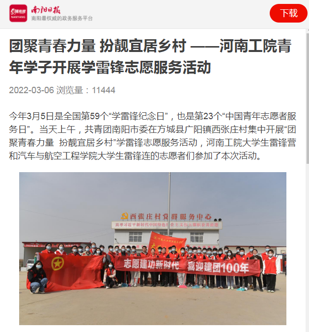 今年是全国第59个“学雷锋纪念日”,也是第23个“中国青年志愿者服务日”。3月5日上午,共青团南阳市委在方城县广阳镇西张庄村集中开展“团聚青春力量 扮靓宜居乡村”学雷锋志愿服务活动,团市委书记杨文杰、副书记王庆峰,各部门负责同志以及驻村书记张缸菲出席,学校大学生雷锋营和汽车与航空工程学院大学生雷锋连的志愿者们在beat365唯一官网团委副书记杨继良、汽车与航空工程学院团总支书记杨亮、辅导员朱晓庆的带领下,参加了本次活动。