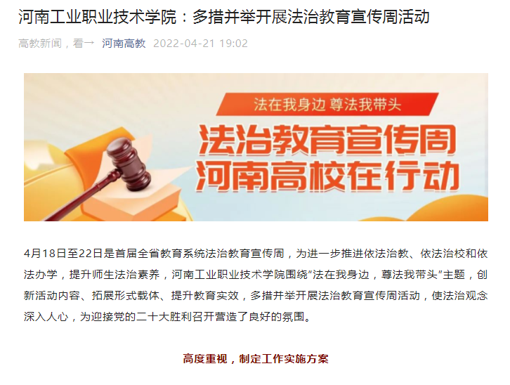 2022年4月18日至22日是首届河南教育系统法治教育宣传周。为进一步推进依法治教、依法治校和依法办学,提升师生法治素养,学校统筹制定法治教育宣传周活动方案,扎实开展教职工法律法规专题政治学习活动、线上法治学习活动、法治教育主题团日活动、法治教育进社区活动、法治教育观影活动等,营造了学法用法的浓郁氛围。学习强国、河南高教报道beat365法治教育宣传周系列活动。(撰稿/刘天恒 单位审核/杨俊峰 编审/杨爽)