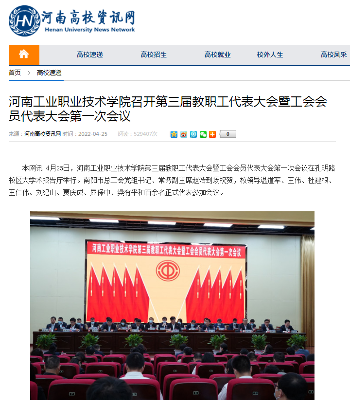 4月23日,学校第三届教职工代表大会暨工会会员代表大会第一次会议在孔明路校区大学术报告厅举行。会上,温道军发表重要讲话,王伟作学校行政工作报告,屈保中作学校第二届工会工作报告。大会选举产生了第三届工会委员会、工会经费审查委员会委员,通过了第三届工会女工委员会及教代会六个专门委员会成员名单,通过了《大会决议》。近日,新华网、中华网、河南高校咨询网等媒体对学校召开第三届教职工代表大会暨工会会员代表大会第一次会议进行了报道。(撰稿/刘天恒 单位审核/杨俊峰 编审/杨爽)