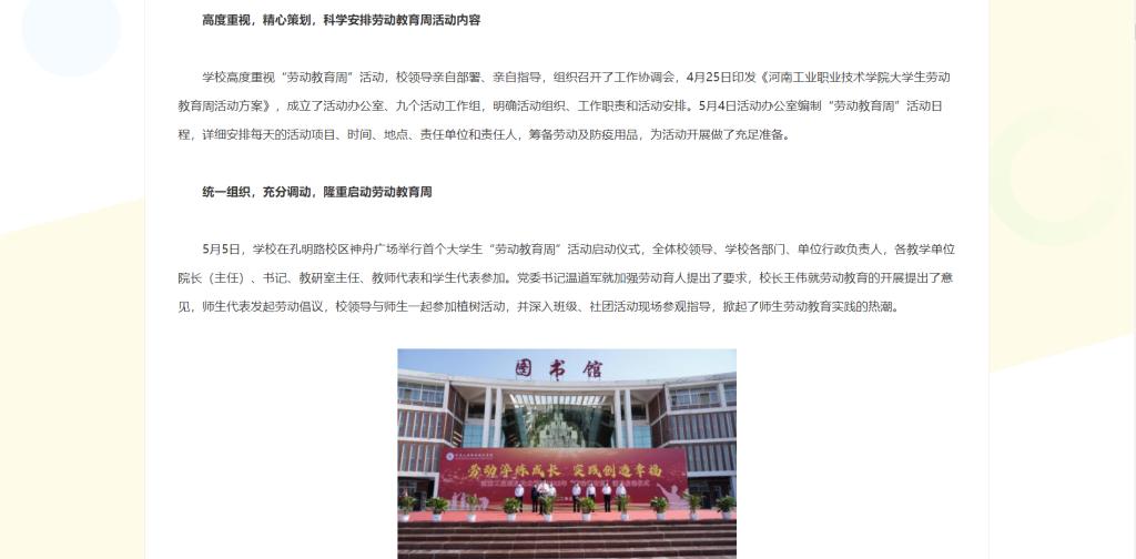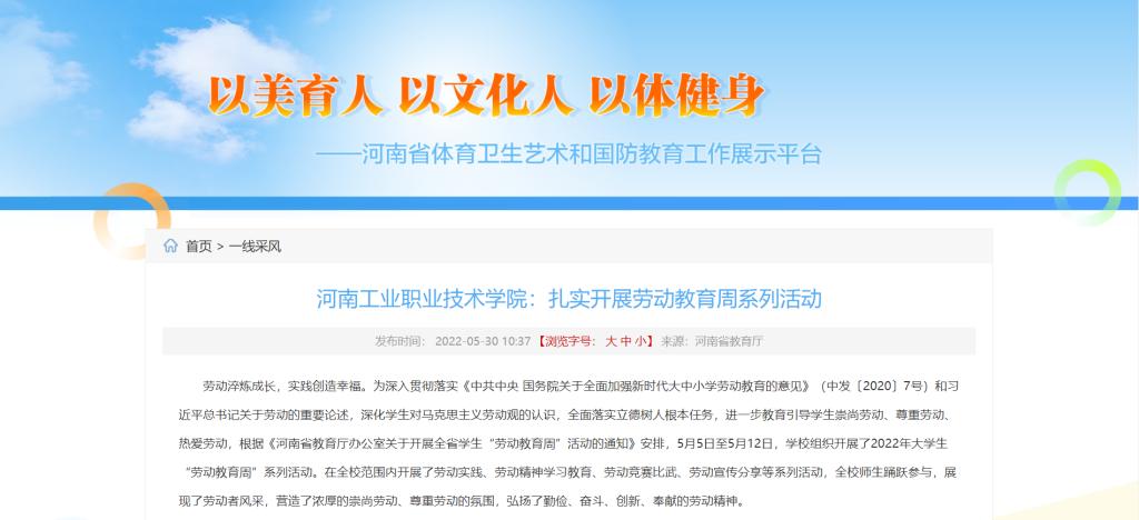 编者按:为全面贯彻党的教育方针,充分发挥劳动教育的育人作用,2022年5月5日至5月12日,学校扎实组织劳动教育周活动,举行“劳动教育周”启动仪式,开展劳动实践活动、劳动精神教育、劳动竞赛比武、劳动宣传分享、劳动主题团日等系列活动,进一步弘扬劳动精神、劳模精神和工匠精神。5月30日,河南省教育厅官网“河南省体育卫生艺术和国防教育工作展示平台”对beat365劳动教育周系列活动进行了宣传展示。(供稿/教务处 撰稿/席东河 单位审核/杜恒 编审/杨爽)