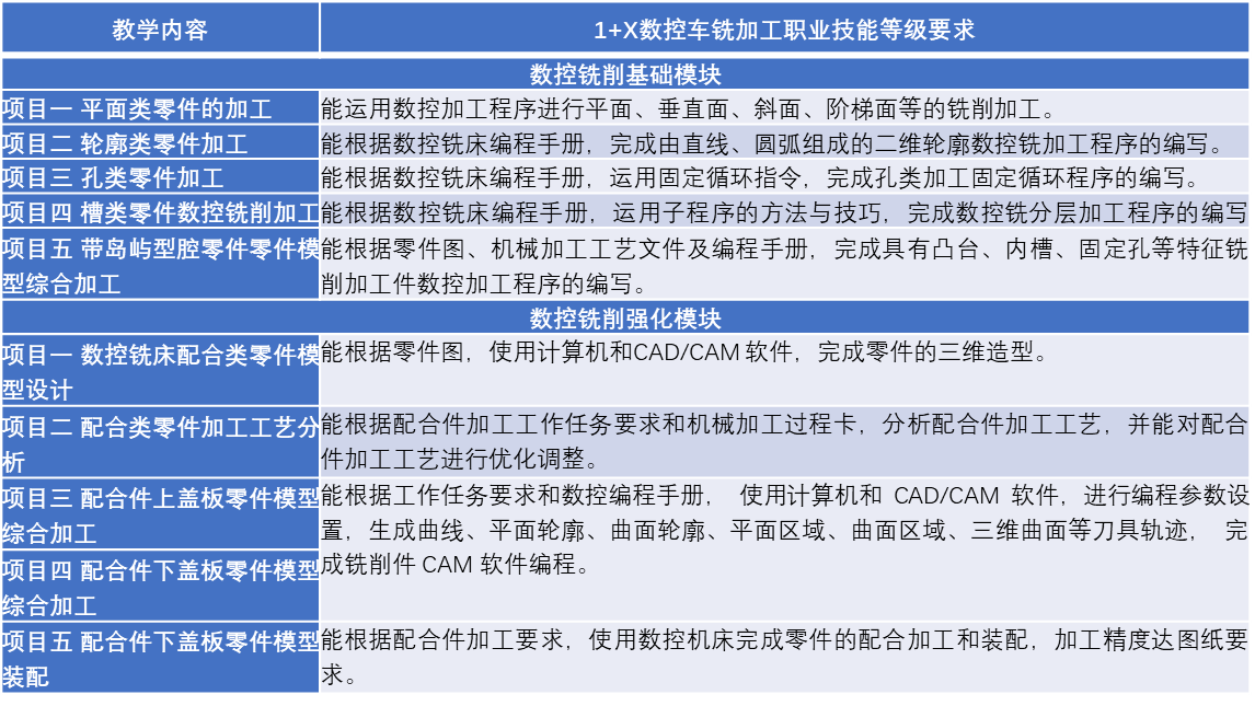 以能力培养为主线,将课程的教学内容与相应的技能等级证书标准衔接起来,将产业新技术、新工艺、新规范纳入教学内容,构建项目化、模块化的“课证融通”课程。以数控车铣加工1+X职业技能等级证书为例,针对数控车铣加工1+X职业技能等级证书对课程设置进行系统梳理,分析支撑人才培养目标和X证书的课程,围绕核心岗位能力与X证书职业技能等级标准,整合课程教学内容,提高教学内容与行业技术技能需求的吻合度。