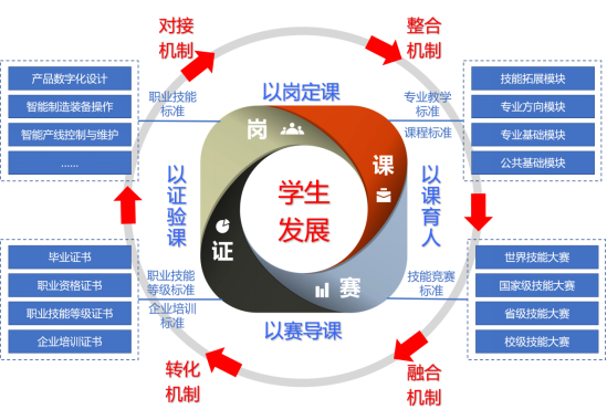 依据专业教学标准,对接职业技能标准、职业技能等级标准、技能竞赛标准、企业培训标准,优化课程供给,以岗定课,以课育人、以赛导课、以证验课,建立“纵向衔接、横向互通”标准体系,健全“岗位精准对接、课程系统整合、标准深度融合、课证有效转化”多维融通机制,优化“岗课赛证”融通的生态系统,实现岗证互通、证赛互认、持证上岗、书证融通,促进智能制造类专业群人才培养质量全面提升。