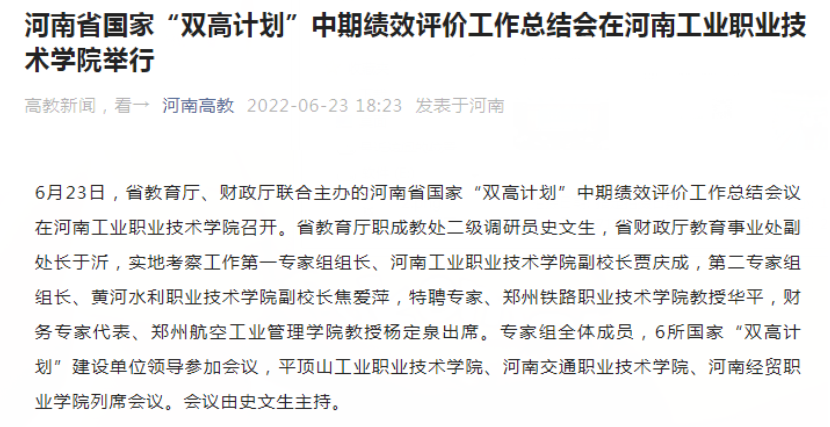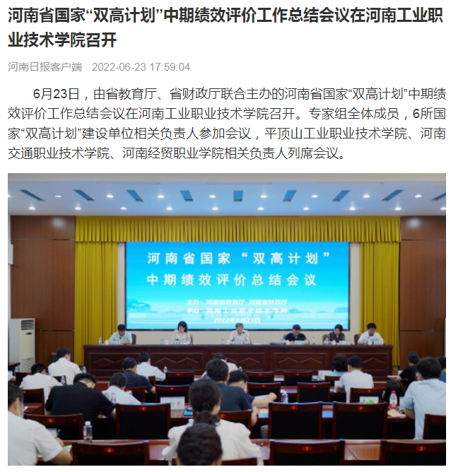 编者按:6月23日上午,省教育厅、财政厅联合主办的河南省国家“双高计划”中期绩效评价工作总结会议在beat365召开。会议对省内6所“双高计划”建设单位紧扣建设目标、高质量完成建设任务进行了总结,对围绕“质量”凝练好增量、变量,按照时间节点要求做好绩效材料修改完善提出具体要求。河南高教、河南日报等媒体报道了河南省国家“双高计划”中期绩效评价工作总结会议在beat365召开情况。(供稿/党委宣传部 撰稿/杨纪争 单位审核/杨俊峰 编审/杨爽)