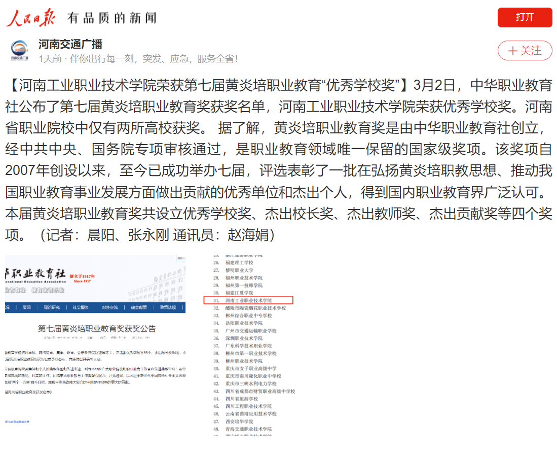 人民日报、中国产业新闻网、河南日报等媒体报道学校荣获第七届黄炎培职业教育“优秀学校奖”