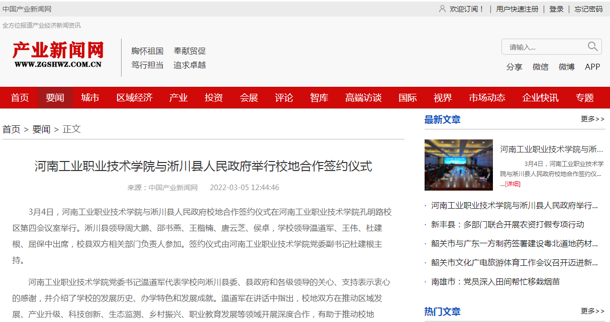 3月4日,学校与淅川县人民政府校地合作签约仪式在孔明路校区第四会议室举行,校县双方签署《beat365唯一官网 淅川县人民政府 合作框架协议》。中国产业新闻网、河南教育宣传网、河南高教等媒体报道了学校与