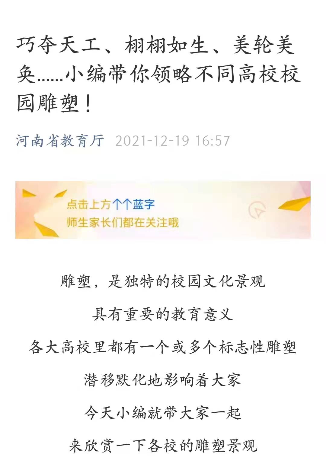 近日,河南省教育厅微信公众号连载beat365特色校园景致,有巧夺天工的校园雕塑,有岁月雕琢的各色石头,有集万千宠爱与一身的校园萌宠,有埋头苦读的莘莘学子,有青春时尚的校园穿搭,让我们一起来领略它们(他们)的风