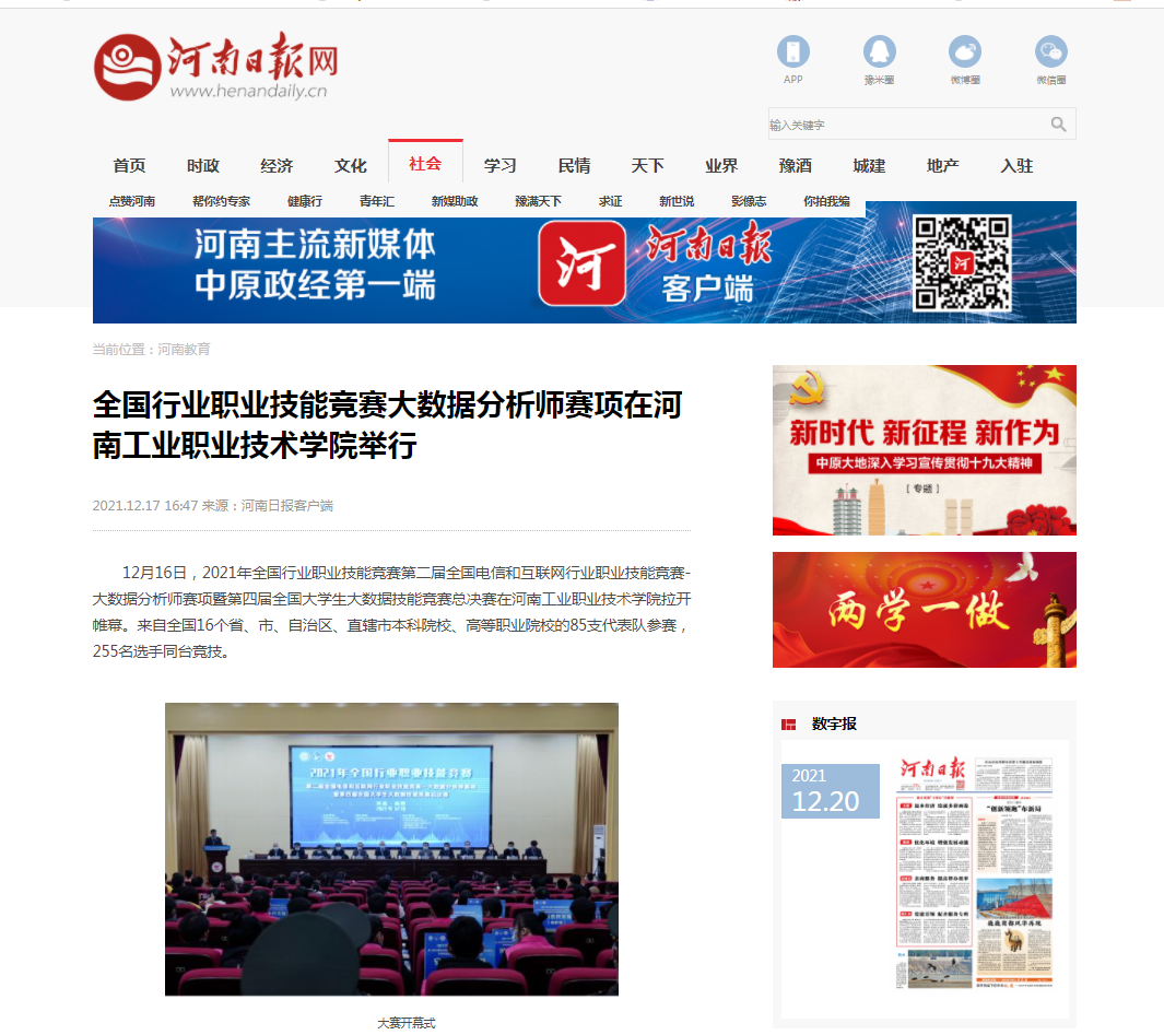 河南日报、河南高教、南阳新闻联播等报道beat365承办全国行业职业技能竞赛大数据分析师赛项
