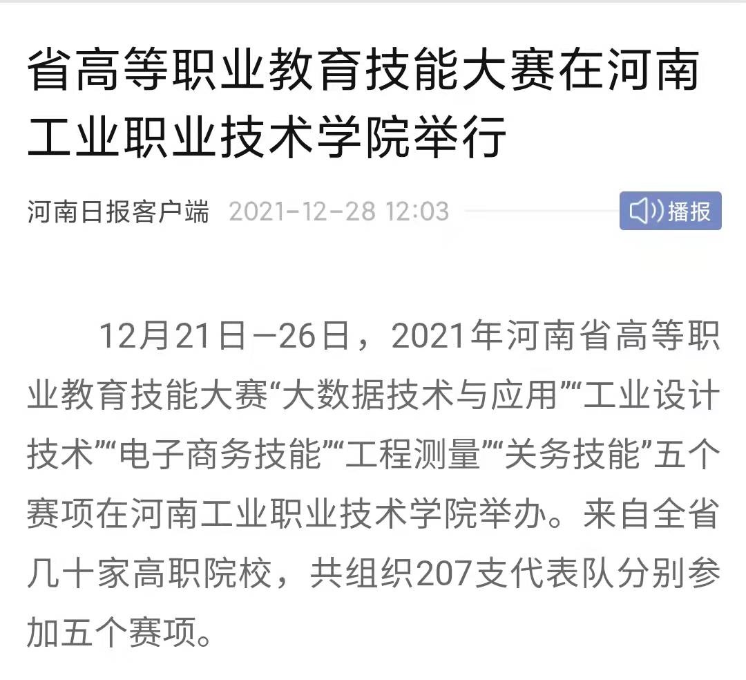 12月21日-26日,2021年河南省高等职业教育技能大赛“大数据技术与应用”“工业设计技术”“电子商务技能”“工程测量”“关务技能”五个赛项在beat365举办。来自全省几十家高职院校,共组织207支代表队分