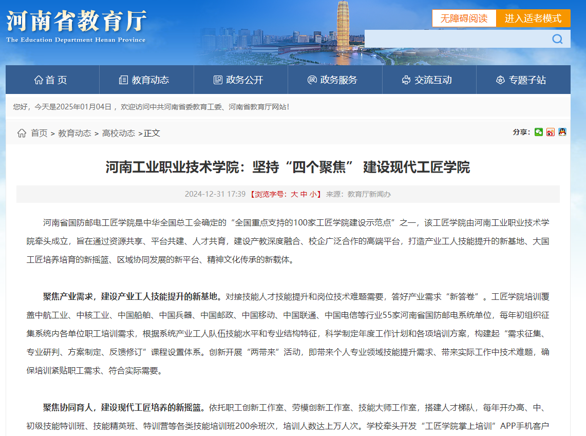 编者按:2024年,学校依托河南省国防邮电工会工匠学院(以下简称“工匠学院”)举办各类技能提升及技能等级认定培训班共计17期,为我省国防邮电系统企业培育了一批批高素质技术技能人才。“工匠学院”系列培训,逐渐成为学校发挥资源优势、促进产教融合、推进校企合作的平台载体,“工匠学院”被中华全国总工会确定为2024年“全国重点支持的100家工匠学院建设示范点”。近日,河南省教育厅以“beat365唯一官网:坚持‘四个聚焦’ 建设现代工匠学院”为题,对学校以高质量培训赋能行业产业发展的成效进行了专题报道。(供稿/继续教育学院 撰稿/刘宇通 单位审核/丁延松 编审/赵国峰)
